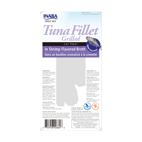 Delicious and tender grilled tuna fillet in a savory shrimp-flavored broth. Perfect as a tasty snack or meal topper for cats. High moisture content supports hydration while providing a low-calorie, flavorful treat.